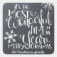 Beautiful typography based holiday sticker. "It's the most wonderful time of the year" appears in white hand-lettered typography on a charcoal grey chalkboard background accented with white snowflakes.