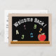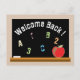 A simple but straight to the point postcard to welcome your students back-to-school . On the front , it has the illustration of a faux chalkboard . On it , it says "Welcome Back!" (You can change this greeting if you wish to.) It also has the letters A , B , C and the numbers 1 , 2 .3 written in light colour chalks . It also has a red apple in the lower right corner . On the back , you can personalise it with your own text (date and time the school will start ) , there is also space to add the teacher's name and signature ,as well as the room number .