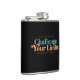 Well made flask, a little better than I had expected. Flask came in clear plastic box which gave it a nice presentation when I took it out of the zazzle packaging. Image is not printed on flask but on sticker. Don't know how this will hold up I haven't used it yet. This would make a Great gift! I plan to purchase more for friends! Cheers. I thought a little brighter than computer. Very crisp, writing wasn't