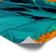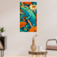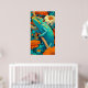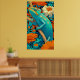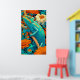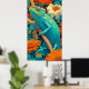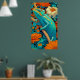 Chameleon in Technicolor: A spectacularly vibrant and richly detailed poster bursting with color. The artwork features a bold, red chameleon with yellow and cyan markings, perched on a branch. Rendered in a dynamic, high-saturation style reminiscent of Pop Art or graphic novel illustration, the reptile stands out against a fantastical forest backdrop. The scene is alive with exaggerated colors—fiery reds, golden yellows, brilliant turquoise, and sky blues—creating an energetic, kaleidoscopic vision of nature. This is a perfect piece to bring a tropical, enthusiastic, and playful statement to any space.