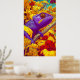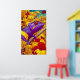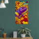 Chameleon in Technicolor: A spectacularly vibrant and richly detailed poster bursting with color. The artwork features a bold, red chameleon with yellow and cyan markings, perched on a branch. Rendered in a dynamic, high-saturation style reminiscent of Pop Art or graphic novel illustration, the reptile stands out against a fantastical forest backdrop. The scene is alive with exaggerated colors—fiery reds, golden yellows, brilliant turquoise, and sky blues—creating an energetic, kaleidoscopic vision of nature. This is a perfect piece to bring a tropical, enthusiastic, and playful statement to any space.