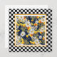 Beautiful and artistic image features tons of colourful white chamomile daisy and orange poppy flowers on black background with black and white chequerboard border