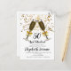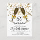 Champagne glasses and gold ribbons with gold confetti on black with white type, 50 and fabulous birthday party invitation. A trendy gold and white invite with a modern script typeface. Sparkling champagne glasses. Personalise with your party information. Great for a male or female. Customise for any age. 30, 40, 60, 70, 80, and over.