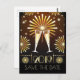 A New Years Eve save the date postcard with a party atmosphere. Golden champagne flutes clinking together with gold coloured fireworks exploding all around. Art Nouveau / art deco style design.
