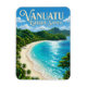 The beach is a perfect crescent of powdery white sand framed by lush tropical rainforest and shallow, iridescent blue waters. It offers a postcard-perfect setting that captures the wild and untouched spirit of the Vanuatu archipelago.