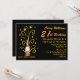 Fun 21st birthday party invitation done in black and golden yellow and peach. Fun graphics of a champagne bottle, with shooting stars and streamers surrounding it, decorates the left side of the invitation. Text in yellow and peach is ready to personalise for your big day. Customise to add text to the back of the card.