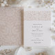 This exquisite wedding invitation features a timeless design with intricate floral patterns in soft beige, blush, and ivory tones. The front showcases a harmonious blend of classic floral ornamentation with refined typography that gracefully announces the wedding details. The reverse side continues the theme with a subtle, yet detailed floral motif, highlighted by the initials for a personalised touch. Perfect for couples seeking a sophisticated and romantic aesthetic, this invitation effortlessly combines elegance with a touch of vintage charm. Ideal for traditional and contemporary weddings alike.