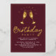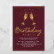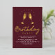 Red and gold birthday party invitations featuring two champagne glasses toasting and "birthday" in a brush script font. "Birthday party" text and the champagne glasses will appear in real metallic foil, while the event details are written in matte white text to be easily readable. Simple and fun adult birthday party invitations that can be changed to any age. Cheers!