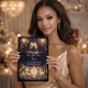 New Year celebration design featuring deep navy and gold tones with fireworks, champagne flutes, and sparkling light effects. Detailed accents include a midnight clock, confetti, and party decor. Script headline with refined layout suited for hosting an upscale evening countdown gathering.