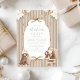 A soft and elegant Christmas invitation featuring a champagne striped background, delicate poinsettia flowers, and cosy holiday details like a teddy bear and Santa in warm neutral tones. Perfect for festive gatherings with a refined, rustic-luxe feel that blends timeless Christmas charm with modern minimalism.