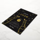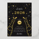 Pop the bubbly! Festive New Year's Eve party invitations feature a two champagne bottle illustrations on a black background adorned with gold foil and white stars.