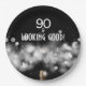 90 & Looking Good paper plates featuring a champagne bottle, sparkler and bokeh blurred lights on a black background - in 2 SIZES. CUSTOMIZE with your own details and age. Use this as a template for a 21st, 30th, 40th, 50th, 60th, 70th, 80th, 90th, 100th birthday. A fabulous product for men and women at any age! See invitations and MATCHING items here ----> http://bit.ly/2CTocgR <----