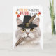 A cute pilgrim hat and a turkey feather in it's mouth, this silvery and creamy coloured tabby cat looks a bit naughty but sends fun-filled feline Thanksgiving wishes.