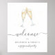 Festive and elegant welcome sign for your engagement party or wedding features a pair of clinking champagne glasses in watercolor, filled with bubbly. Personalise with three lines of custom text beneath; shown with "welcome" and the couple's names and event type.