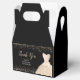 A beautiful champagne white themed elegant watercolor dress gown on a black background with faux glitter at the top and bottom of the favor box.