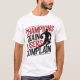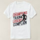 This white t-shirt features the word "CHAMPIONS" in a bold red font at the top, followed by "TRAIN USERS" also in red but slightly smaller. Underneath, "COMPLAIN" is displayed in a larger, bolder red font. To the right, there's a graphic of a basketball player, who appears to be Black, dribbling a ball. The design is sporty and assertive.