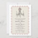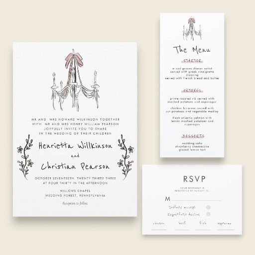Celebrate your love story with this exquisite Victorian-inspired wedding invitation. Featuring a delicate pink bow adorning a charming chandelier illustration, this design evokes a sense of romance and timeless elegance. The soft pastel background and intricate lace border add a touch of vintage sophistication, perfect for couples who appreciate classic beauty. Announce your special day with an invitation that sets the tone for a memorable celebration. Share details of your joyous occasion with family and friends through this beautifully crafted announcement, hinting at the charm of your wedding website.