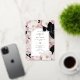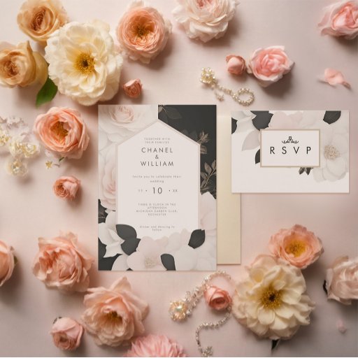 Elegance personified! This Chanel-inspired wedding invitation is a luxuriously adorned masterpiece. The text is embraced by opulent pink, white bejeweled flowers, and delicate black accent leaves, creating an invitation that exudes timeless style and romantic sophistication. The frame and heart logotype is presented in rose gold foil.