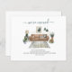 This moving announcement card is modern and features quirky, boho plants, a couch, and a cat relaxing on it. Check out the rug and the wall art and vintage overhead lamps. Something your recipients would smile about