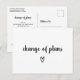 Minimalist Wedding Postponement Announcement Postcard featuring a simple and cute design with the words, "change of plans" in a thick black script handwriting along with a hand drawn heart, over a white background. The text and background may be changed to any colours you wish. The backside has your personal message and return address for easy mailing. A chic and modern design to announce that your wedding has been postponed.