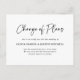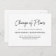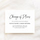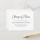 These elegant and minimalist wedding reschedule, cancellation, or postponement postcards feature black, modern script that says "change of plans" on a clean white background. If you must change or cancel the date of your wedding or postpone any other special event, this is a simple way to do so.