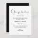 Modern and minimal black and white wedding cancellation or wedding postponement card with minimalist script font for "change of plans".