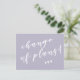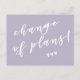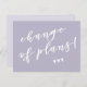 NewParkLane - Postcard, with 'Change of Plans' in elegant white brush script / calligraphy typography and three cute little hearts, against a lavender background.