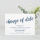This is a Postponed (Postponement) Wedding Announcement card, with card title, Change of date, in Navy Blue script font, Modern Rustic design themed.