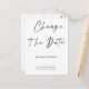 These custom modern, simple Change the Date cards are an elegant way to notify your guests of your change of date. The modern design features Change the Date, your words, names and special date in script and bold typography. The back has a note to your family and friends. Click "personalise this template" to change all of the wording to your own. Please see our other matching designs in our store. If you need any help with customisation or special requests, please email me at ybnormalone @gmail.com. Thanks for stopping by www.zazzle.com/Personal_Creations. ©Karen Hall for Personal_Creations at Zazzle.