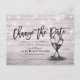 Modern Wedding Announcement Postponement Photo Postcard Templates - Elegant Lettering Script, Vintage Champagne Glasses and String Lights on Rustic Wood Background.