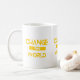 The mug design features the quote "Change the world" in a bold, handwritten font against a vibrant, gradient background of blues and greens. The mug is ceramic with a comfortable handle and is designed to be both eye-catching and uplifting.