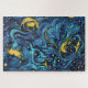 “Channeling Van Gogh”, (vaguely reminiscent of Vincent van Gogh’s painting, “The Starry Night”), swirls rich in blue, aqua and yellow will surely challenge the jigsaw enthusiast. Reproduced from one of my most popular miniature abstract paintings.