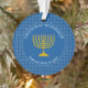 Stylish Tekhelet Blue CHANUKAH BLESSINGS Acrylic Ornament with faux silver Star of David in a tiled pattern in the background, and a faux gold menorah at the centre. The text reads CHANUKAH BLESSINGS FROM OUR HOME TO YOURS and is CUSTOMIZABLE, so you can amend the message as desired, or replace with a name. Part of the HANUKKAH Collection by Berean Designs.