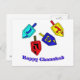 A Happy Chanukah gift featuring 4 dreidels with Hebrew letters which represent A Great Miracle Happened There!