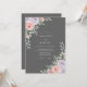 This elegant design features a deep charcoal grey background that provides a striking contrast to the soft floral elements. Lush pink and lavender peonies are nestled amongst silver dollar eucalyptus and wispy green ferns. The botanical clusters create a balanced and sophisticated aesthetic. Perfect for a moody romantic evening or a refined seasonal affair.