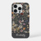 This custom iPhone case features a vibrant garden scene, providing a charming and unique look for your device. The charcoal grey background highlights a dense pattern of hand-painted watercolor wildflowers in warm earthy tones, including terracotta, dusty rose, and golden yellow. Detailed butterflies are scattered throughout the blooms, adding a whimsical and lively feel to the design.