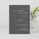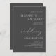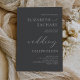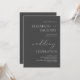 This simple, elegant wedding celebration invitation features the word "wedding" in stylish white script. Personalize it with the names of the bride and groom in white serif capital letters (joined by the word "and" in script that matches "wedding") and the remaining text in lowercase white italics on a charcoal gray background.
