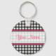A keychain featuring a charcoal grey gingham background with hot pink trim. Personalise with your name over sheer centre section.