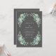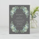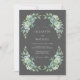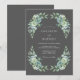 A moody and sophisticated aesthetic features a deep charcoal grey backdrop that makes the botanical elements pop. Lush watercolor roses in shades of mint and pale cream are surrounded by delicate eucalyptus leaves and verdant foliage. This design evokes a timeless atmosphere, perfect for a formal winter or autumn event with its muted, earthy tones.