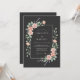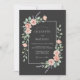 This design features a deep charcoal background that beautifully contrasts with soft peach roses and lavender sprigs. The botanical arrangement flows gracefully across the backdrop, creating a sophisticated and moody aesthetic. Delicate sage green leaves add a natural touch to the romantic floral display, making it ideal for a formal evening affair.