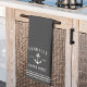 Customise your beach house kitchen with this cute personalised towel featuring your family name or house name and year established in soft ivory lettering accented with a nautical anchor illustration on a charcoal grey background.