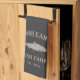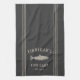 Customise your fishing cabin kitchen with this cute personalised towel featuring your family name or house nickname and year established in soft tan lettering accented with a fish illustration on a charcoal grey background.