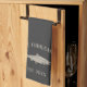 Customise your kitchen with this cute personalised towel featuring your family name or house name and year established in soft tan lettering accented with a fish illustration on a charcoal grey background.