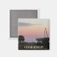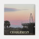 This magnet features a photo of sunset over the Cooper River in Charleston, SC with the Ravenel Bridge and a Palmetto tree in silhouette.