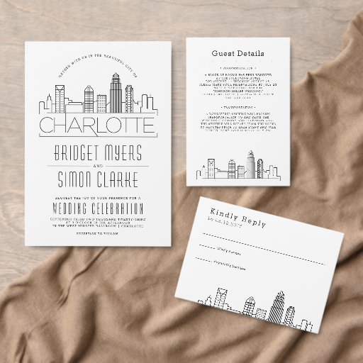 Make an impression and excite your future wedding guests who will travel from far and wide for your wedding ceremony! This fun and formal invitation puts a highlight on the wonderful destination city of Charlotte, North Carolina.