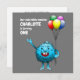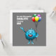 A charming blue creature is holding some colorful balloons ready for the birthday party.