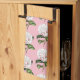 This lovely Charming Camellia Floral kitchen towel features a beautiful Victorian botanical graphics of a white and pink Countess of Orkney camellias with green leaves on a pink background.