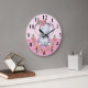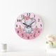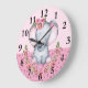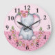 This sweet elephant wall clock for a baby nursery or a kids bedroom features a sweet design with a cute gray watercolor baby elephant with floral decorations and an animal print border. Perfect for a girl's baby nursery or any child who loves elephants.