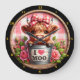 Bring rustic charm home with this adorable wall clock featuring a fluffy Highland cow calf peeking from a bucket. Adorned with a gingham bow and surrounded by vibrant pink roses, it's a heartwarming piece. Perfect for farmhouses, nurseries, or any space needing a touch of sweet, cuddly decor.