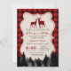Rustic, hunting theme look design: a washed old barn shape with dotted red buffalo frame, deers with red buffalo overlay, fir trees, all on a red black buffalo plaid as background. Use Personalise tool to add your info. For matching items, please, visit my Lumberjack Party Collection.